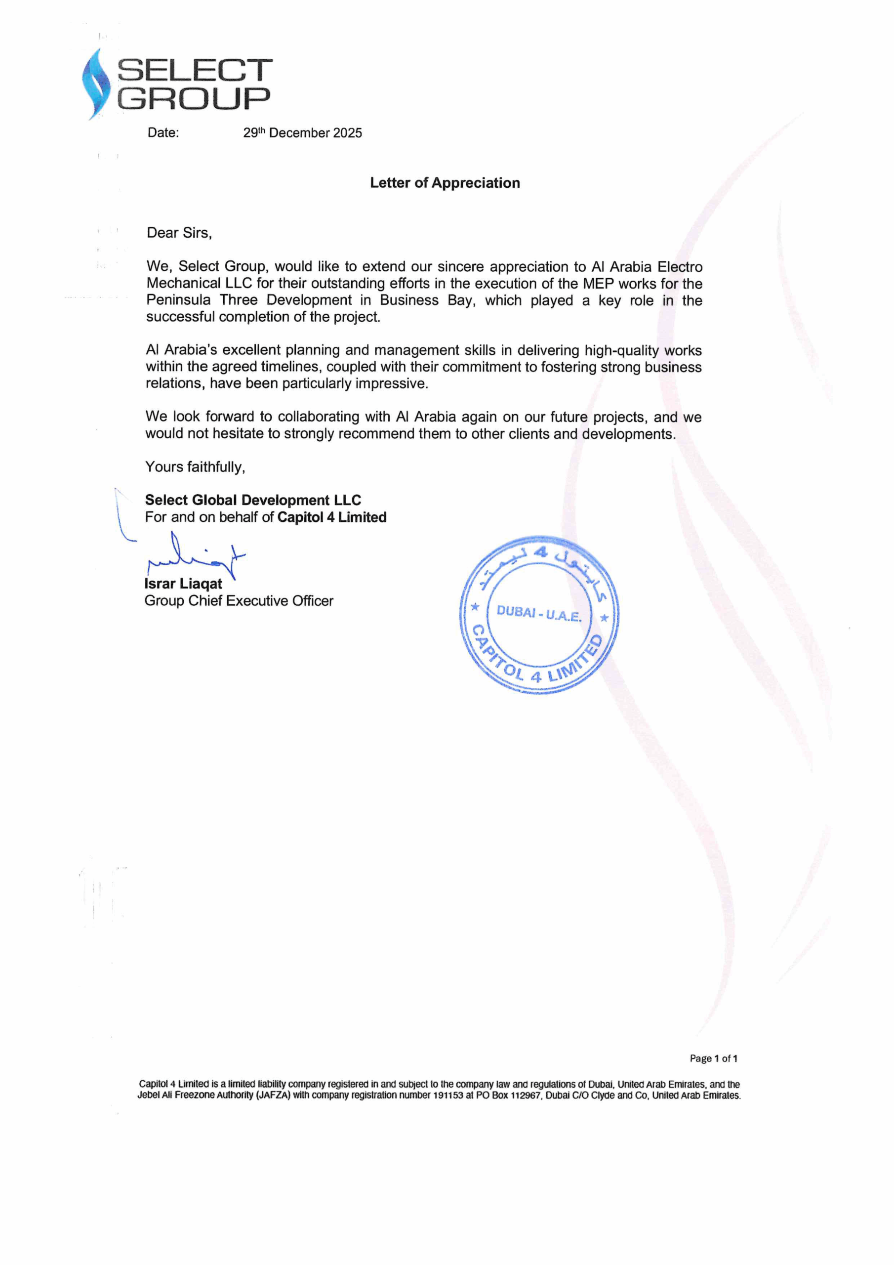 Peninsula Plot B - Business Bay - (Appreciation Letter - Select Group)
